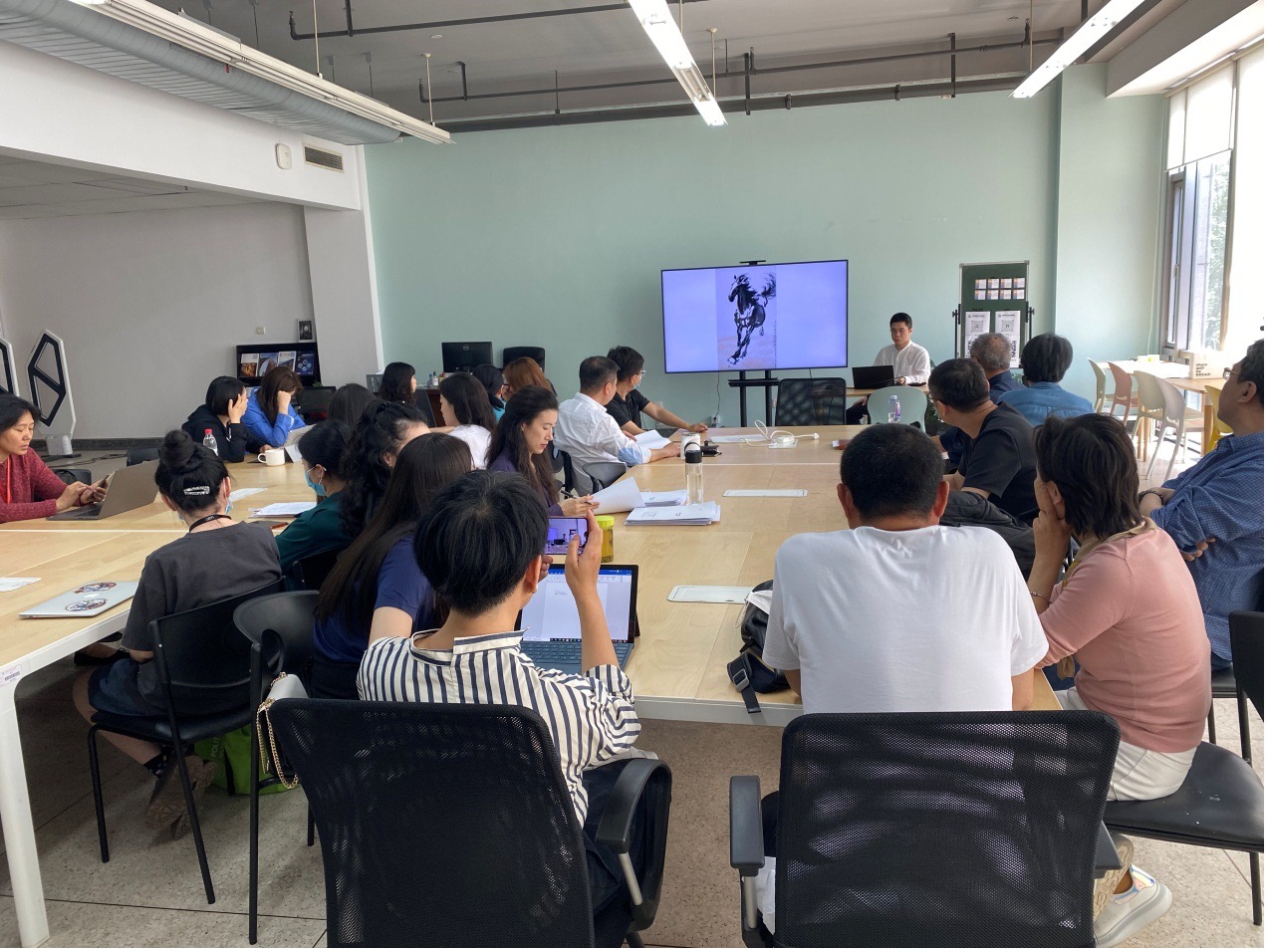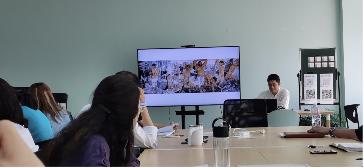 62日下午,学院在新主楼B332组织召开了全体教职工党课“学习日”活动。学院王群书记介绍了学习的主题:美术经典中的党史学习之徐悲鸿绘画中的红色精神,该讲座由党员教师赖盛老师主讲。