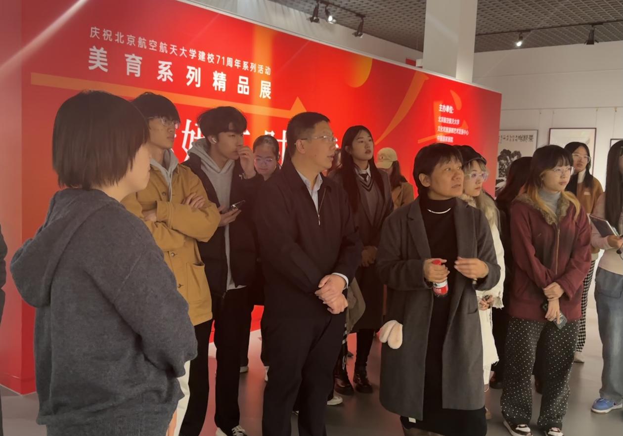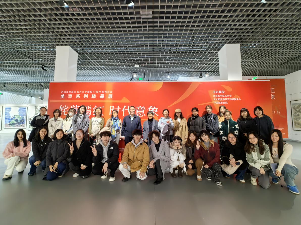 为提高学生的艺术鉴赏能力,拓展绘画视野,了解当代具有代表性的中国画作品,2023年11月8日,okooo澳客网 222612班开展“绘画艺境旅 美育探索行”主题班会活动,参观由北航美育中心承办的“姹紫嫣红·时代意象——中国国家画院花鸟画主题创作学术邀请展”美育系列精品展。活动邀请了吕卫锋副校长一同参与,学院绘画专业系主任李佳教授为大家介绍和解答关于中国画的疑问。