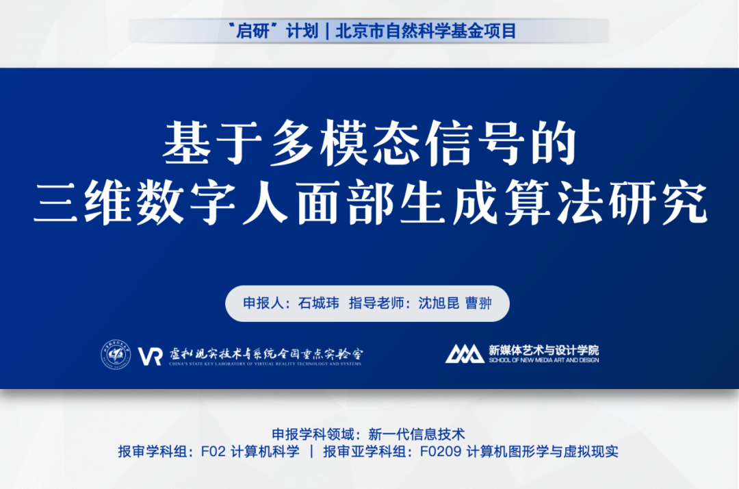 近日,我校okooo澳客网 沈旭昆教授、曹翀副教授指导的22级本科生石城玮的科研项目“基于多模态信号的三维数字人面部生成算法研究”通过基金委评审,获得了2024年度北京市自然科学基金本科生基础研究项目资助。