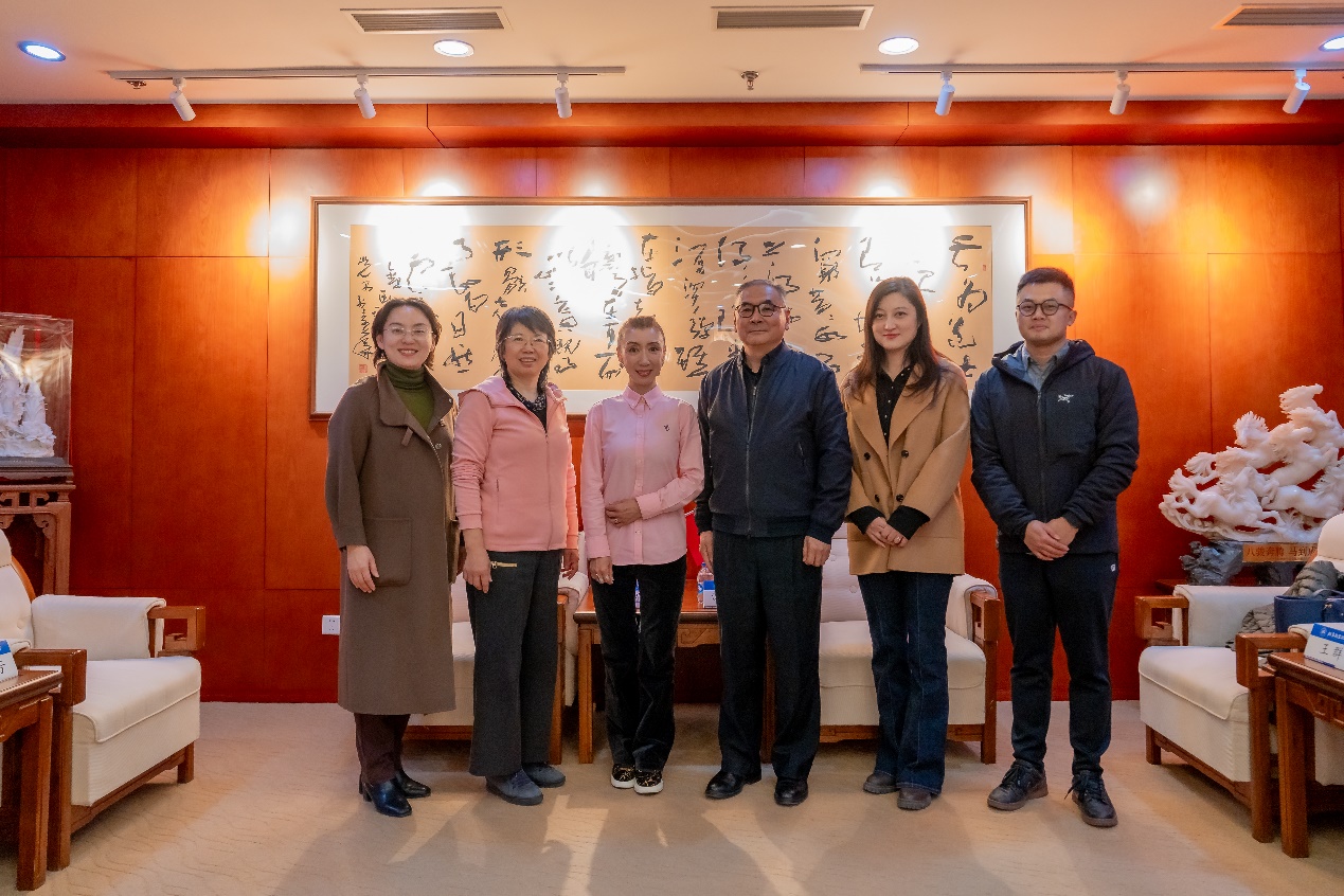 讲座开始前,美育中心主任兼okooo澳客网 院长沈旭昆、okooo澳客网 党委书记王群、校工会副主席张芳与王瑾亲切交流并赠送北航纪念品。