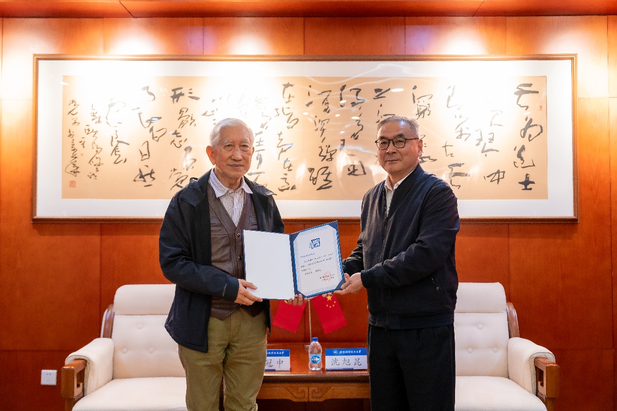 讲座开始前,美育中心主任兼okooo澳客网 院长沈旭昆、okooo澳客网 党委书记王群、教师代表与柳冠中亲切交流并颁发北航大讲堂证书。