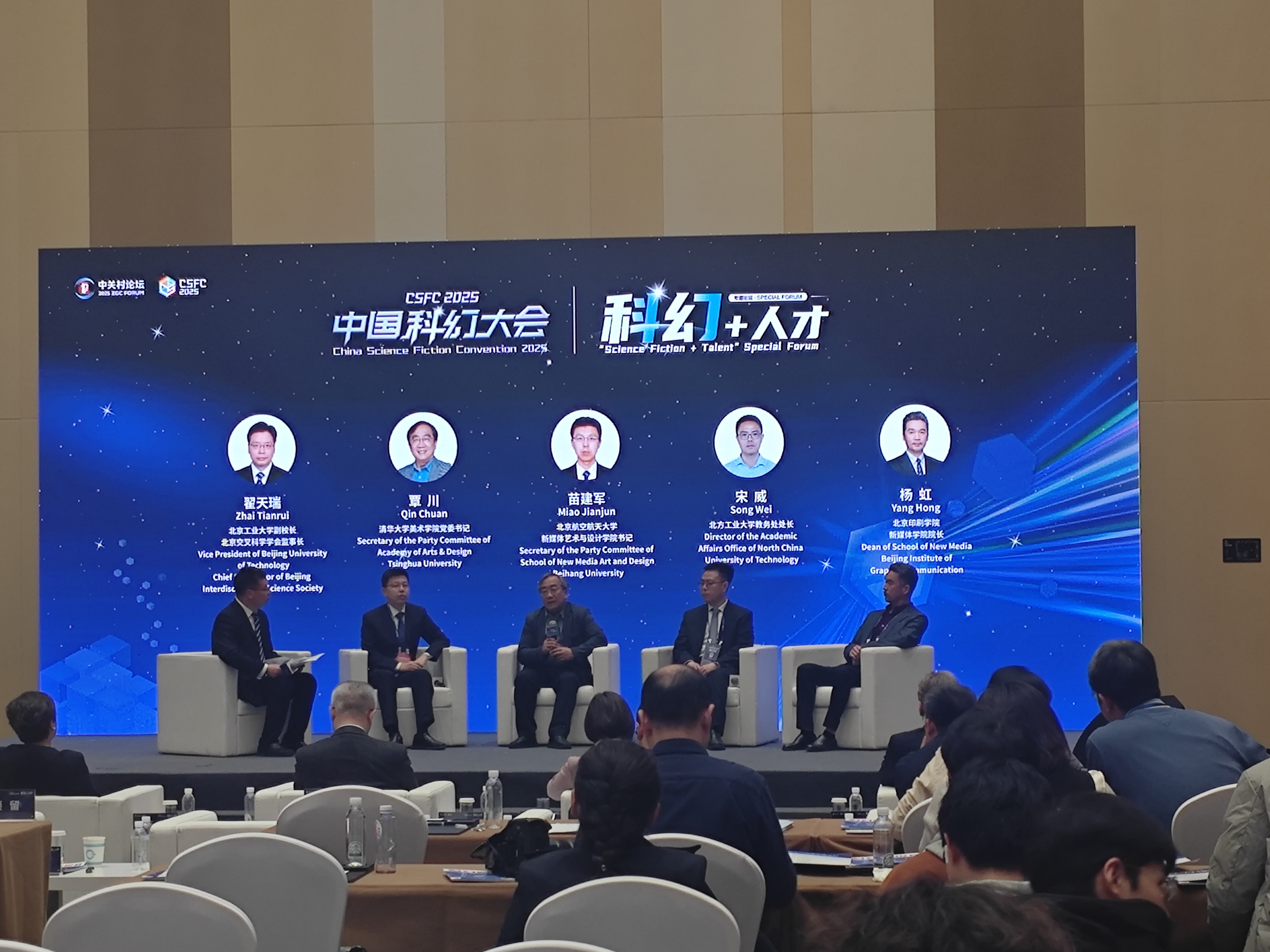 作为2025中国科幻大会的主要承办单位之一,北京市科学技术协会特别策划了“科幻+”专题论坛,聚焦人才、人工智能、生命科学、未来交通等四大主题,搭建了科幻领域和高层次人才对话的平台。论坛邀请了来自国内外社会组织、高校、科研院所、企业等领域的知名专家和行业翘楚,与科幻创作者们同台交流,共同探讨科幻与不同领域的融合发展。通过不同国家、不同行业、不同角度的思维碰撞,为大家带来了前沿的学术观点和产业洞见。值得一提的是,在四大主题中,北航团队作为主要嘉宾,深度参与了其中三个主题。分别是:“科幻+人才”圆桌对话的特邀嘉宾北航okooo澳客网 党委书记苗建军,“科幻+人工智能”圆桌对话的特邀嘉宾北航okooo澳客网 副教授马晓娜,“科幻+未来交通”圆桌对话的特邀嘉宾北航科学技术研究院合作与成果处副处长马晓磊。